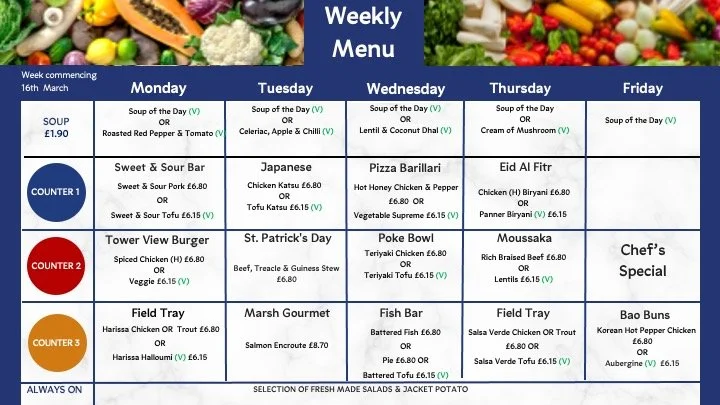 Experience culinary excellence across our three dynamic food counters, each featuring weekly-changing menus with both hearty meat and thoughtful vegetarian/vegan options.
